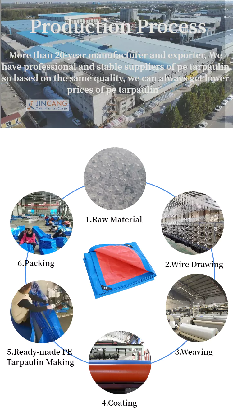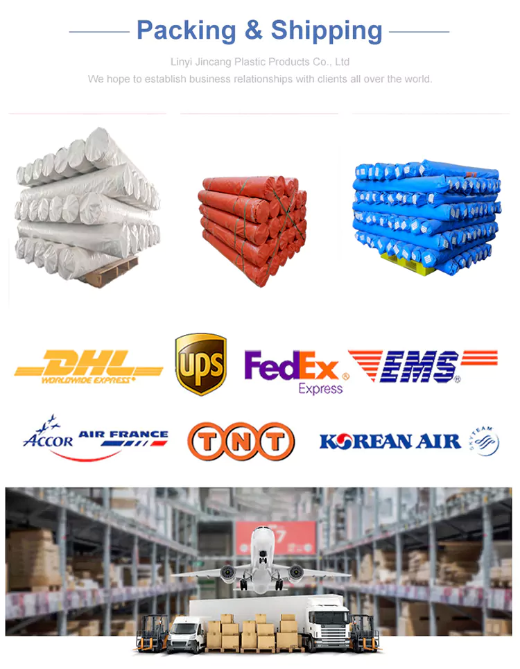 Jincang เป็นหนึ่งในผู้ผลิต PE Tarpaulin Roll มืออาชีพในประเทศจีน 90 GSM Strip PE Tarpaulin Roll แพ็คต่อม้วน ความกว้างมักจะเป็น 1.83m, 2m, 4m, 5m, 6m ความยาวมักจะเป็น 63m, 91, 100m 200m เป็นต้น และเรายังสามารถปรับแต่งตามความต้องการของคุณ มีการใช้กันอย่างแพร่หลายสำหรับการป้องกันกลางแจ้ง ครอบคลุมสินค้า สถานที่ก่อสร้าง เกษตรกรรม และที่พักพิงชั่วคราว