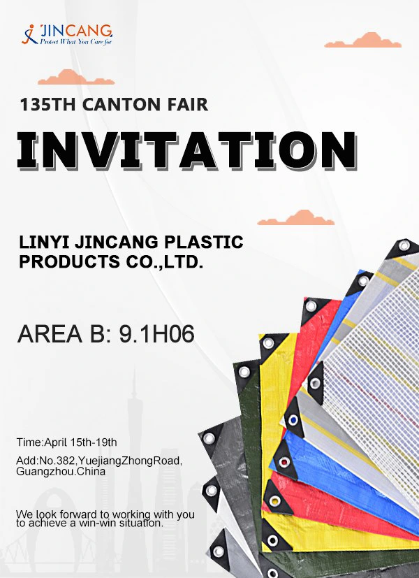 ในฐานะผู้ผลิตชั้นนำของ Linyi Jincang Plastic Products Co Ltd เราจะเข้าร่วมงาน Canton Fair ที่ 135 ตั้งแต่วันที่ 15 -19 เมษายนใน Guznghou ประเทศจีนที่รู้ว่าคุณอยู่ในธุรกิจของ PE tarpaulin เราขอเชิญคุณไปเยี่ยมชมบูธ H06,9.1