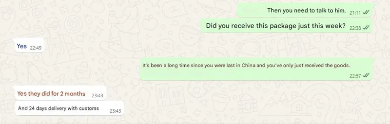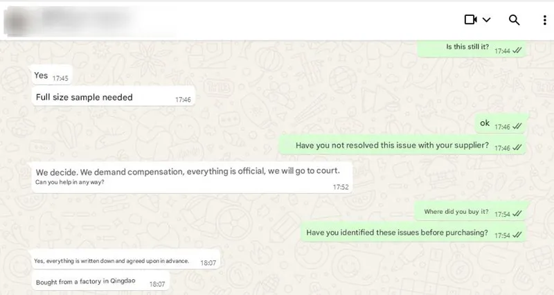 เมื่อเร็วๆ นี้เราได้เรียนรู้ว่าลูกค้าประสบปัญหาร้ายแรงกับการสั่งซื้อผ้าใบกันน้ำจากคู่แข่ง พวกเขาถูกล่อลวงด้วยราคาที่ต่ำ และในที่สุดโรงงานก็ใช้เวลาสองเดือนในการผลิตให้เสร็จสมบูรณ์ เมื่อจัดส่งพวกเขาพบว่าสินค้าหมดสต็อกและไม่ได้มีขนาดตามที่ตกลงกันไว้แต่แรก ขณะนี้ลูกค้ากำลังพิจารณาดำเนินการทางกฎหมาย ด้านล่างนี้คือบันทึกการสื่อสารของฉันกับลูกค้ารายนี้